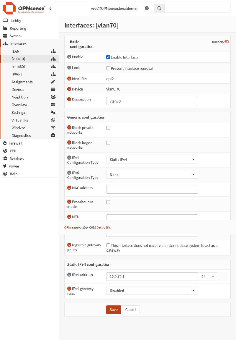 Interfaces > [nombre vlan]. Aquí nos encontraremos muchas opciones para configurar la VLAN. Generalmente nos interesará habilitar la interfaz y asignarle una IP.