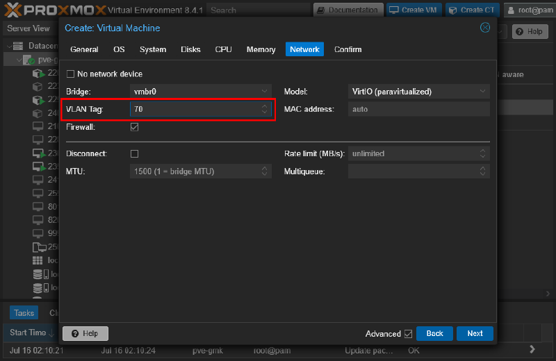 Luego, para crear una máquina dentro de la VLAN que hemos configurado, nos dirigiremos al apartado Network e introduciremos la VLAN tag que hemos introducido anteriormente. Si queremos aplicarlo a una máquina ya existente, lo configuraremos desde Nodo - VM - Hardware - Network Device